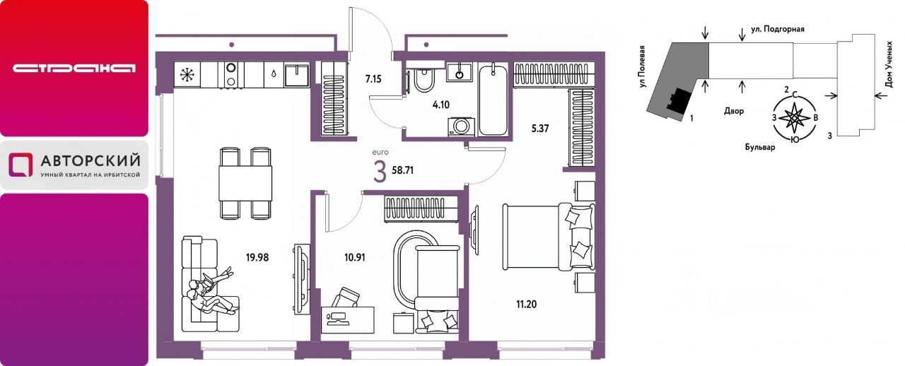 Продается 3комнатная квартира на 10 этаже от застройщика Страна Девелопмент. Площадь квартиры 58,71 кв. м.