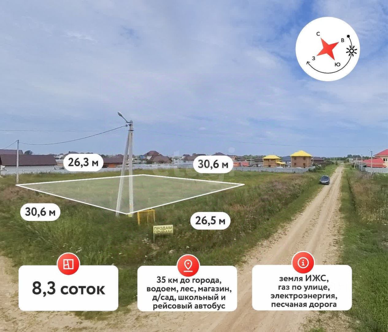 Участок расположен на возвышенности, что исключает риск подтопления и обеспечивает сухость территории. Подъезд к участку осуществляется по песчано-щебеночной дороге, а связь с городом обеспечивает асфальтированная трасса, проходящая через живописный сосновый бор.