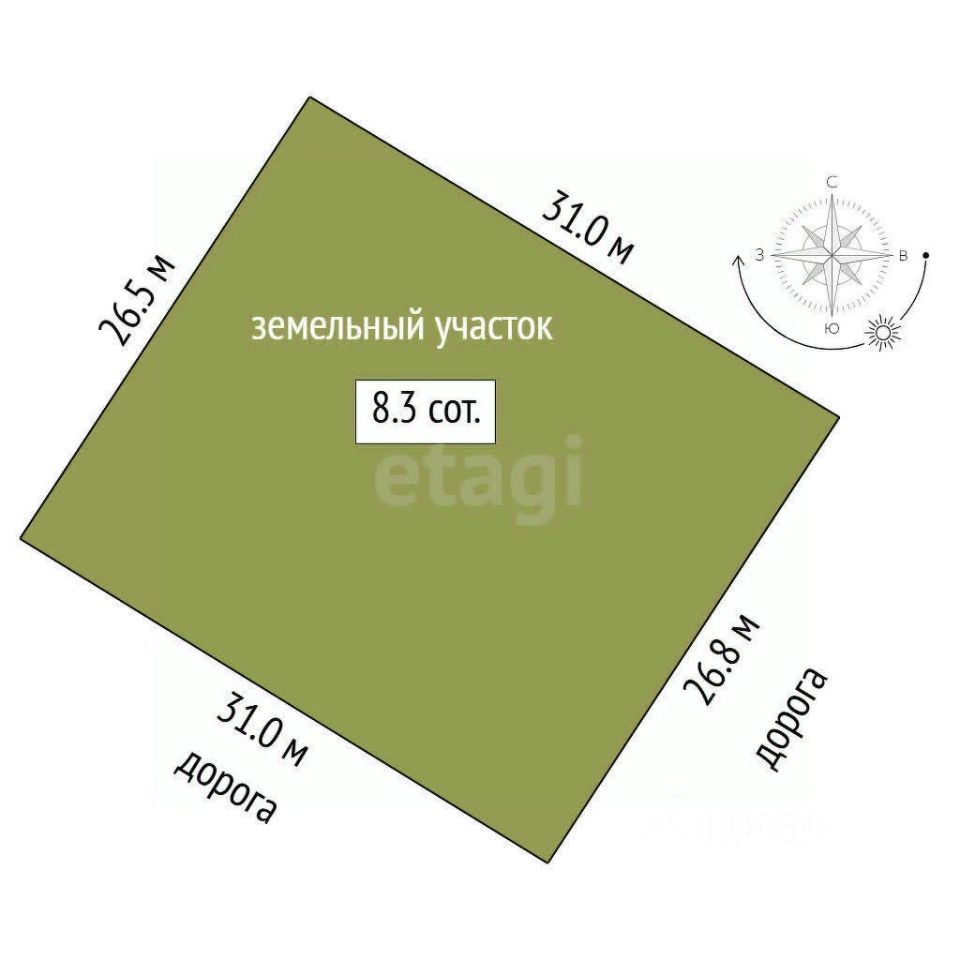 Площадь участка 8,31 сотки (27x31 м) правильной формы.