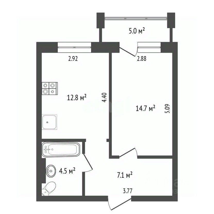 В квартире отличная планировка: -просторная кухня 12,8 м², - большая жилая комната с выходом на лоджию - глубокая ниша в прихожей позволяет обустроить полноценную гардеробную. - просторная лоджия (не застеклена) - санузел совмещенный 4.5 м.кв.