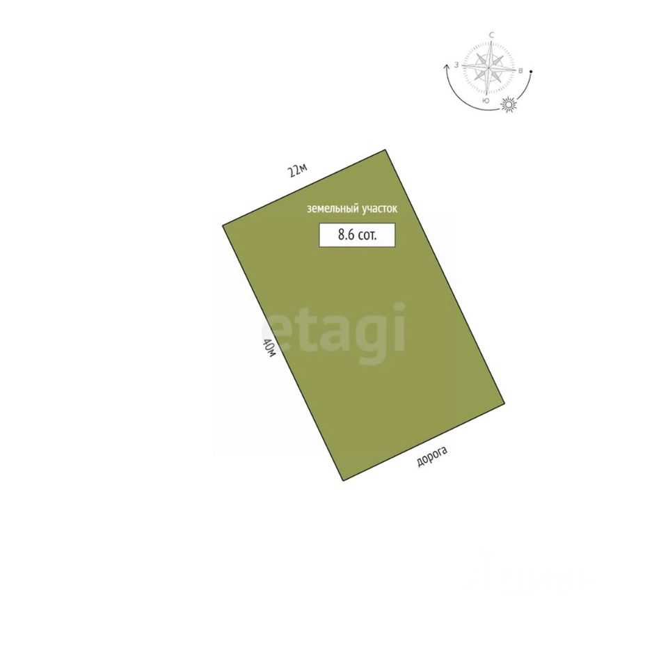 Участок просторный площадью 8,6 сотки, имеет правильную прямоугольную форму размером 40*22 м. Рядом находится электрический столб, что предоставляет возможность подключиться к электросети.