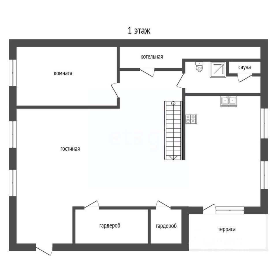 Первый этаж — для жизни и общения: просторная кухня-гостиная, где собирается вся семья, уютная комната(гостевая или кабинет), санузел, гардеробная, котельная и настоящая сауна чтобы отдых был не только душевным, но и телесным.