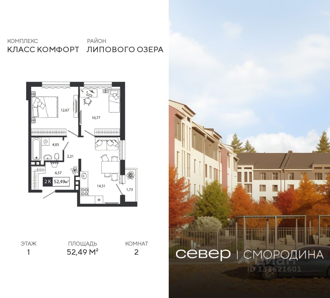 Продаётся квартира площадью 52.49 м2 в жилом комплексе ''Смородина''. Квартира находится на 1 этаже, жилая площадь квартиры 23.44 м2, площадь просторной кухни — 14.51 м2. Среди особенностей планировки — изолированные комнаты с окнами на одну сторону, 1 совмещённый санузел.