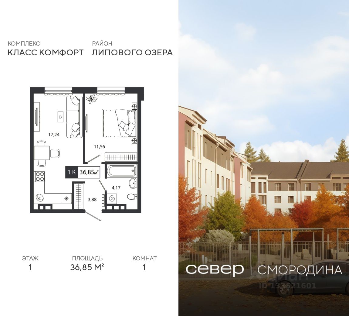 Продаётся квартира площадью 36.85 м2 в жилом комплексе ''Смородина''. Квартира находится на 1 этаже, жилая площадь квартиры 11.56 м2, площадь просторной кухни — 17.24 м2. Среди особенностей планировки — изолированные комнаты с окнами на одну сторону, 1 совмещённый санузел.