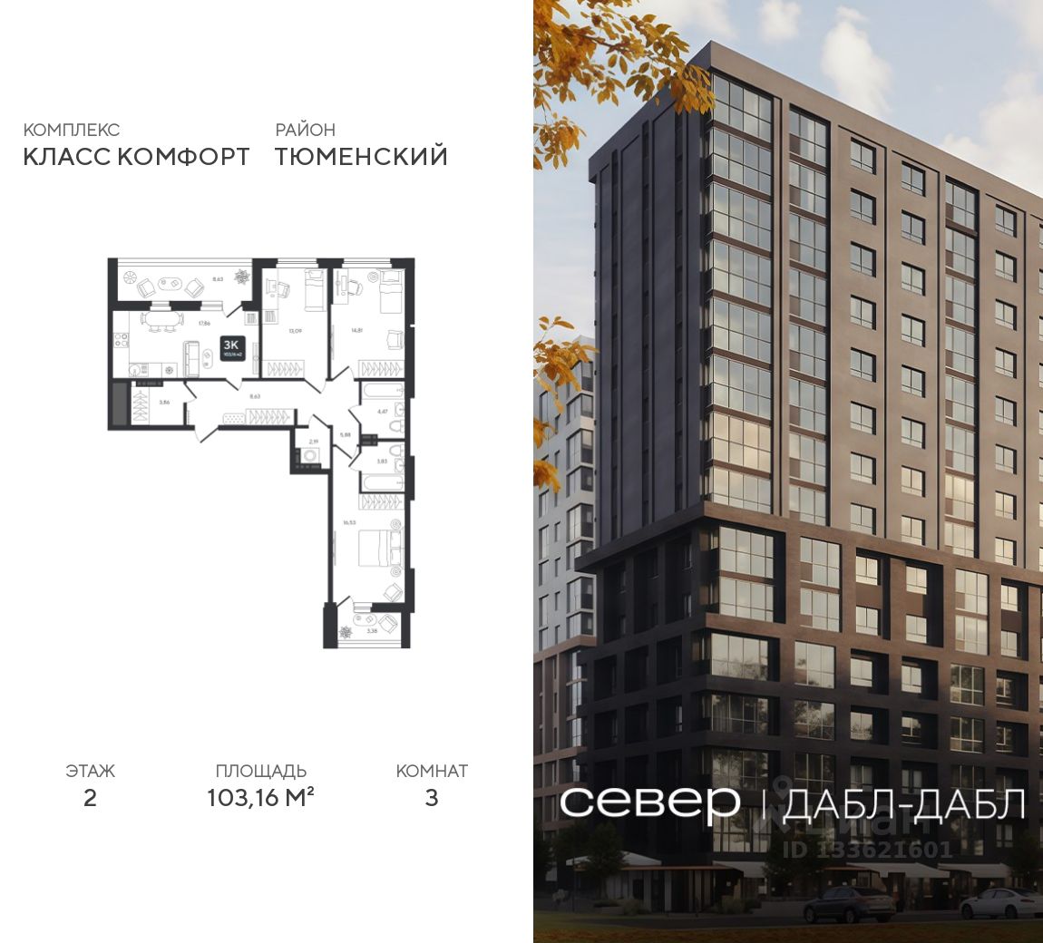 Продаётся квартира площадью 103.16 м2 в жилом комплексе ''Дабл-Дабл''. Квартира находится на 2 этаже, жилая площадь квартиры 44.43 м2, площадь просторной кухни — 17.86 м2. Среди особенностей планировки — изолированные комнаты с окнами на одну сторону, 1 совмещённый санузел.