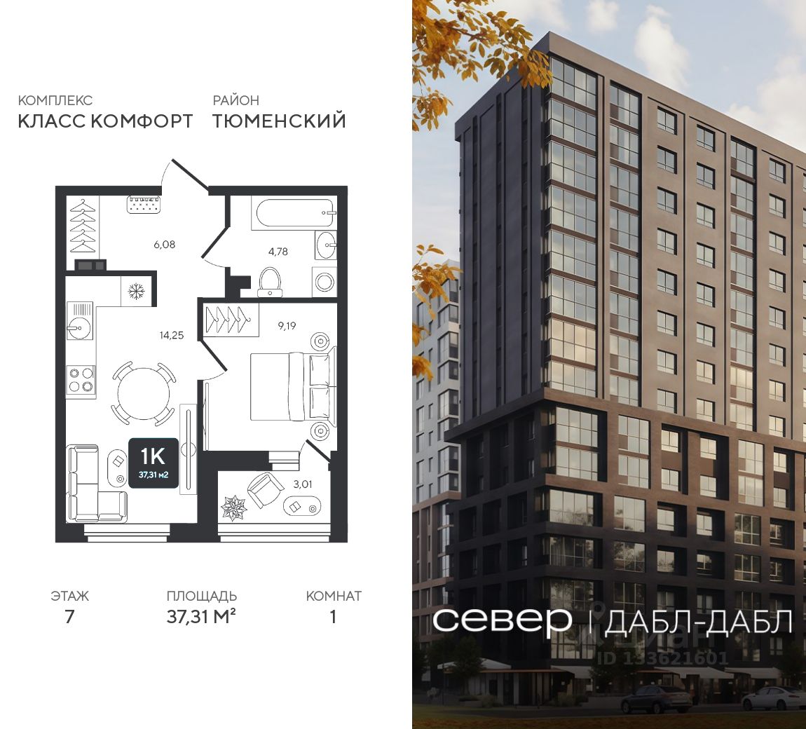 Продаётся квартира площадью 37.31 м2 в жилом комплексе ''Дабл-Дабл''. Квартира находится на 7 этаже, жилая площадь квартиры 9.19 м2, площадь просторной кухни — 14.25 м2. Среди особенностей планировки — изолированные комнаты с окнами на одну сторону, 1 совмещённый санузел.