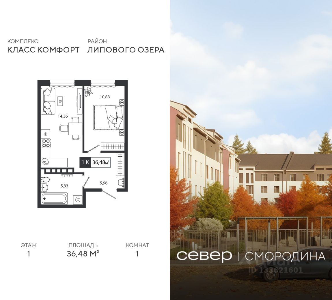 Продаётся квартира площадью 36.48 м2 в жилом комплексе ''Смородина''. Квартира находится на 1 этаже, жилая площадь квартиры 10.83 м2, площадь просторной кухни — 14.36 м2. Среди особенностей планировки — изолированные комнаты с окнами на одну сторону, 1 совмещённый санузел.