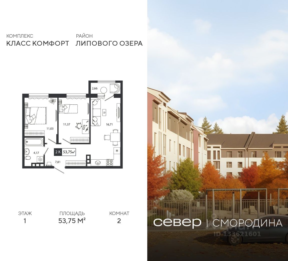 Продаётся квартира площадью 53.75 м2 в жилом комплексе ''Смородина''. Квартира находится на 1 этаже, жилая площадь квартиры 22.4 м2, площадь просторной кухни — 16.71 м2. Среди особенностей планировки — изолированные комнаты с окнами на одну сторону, 1 совмещённый санузел.