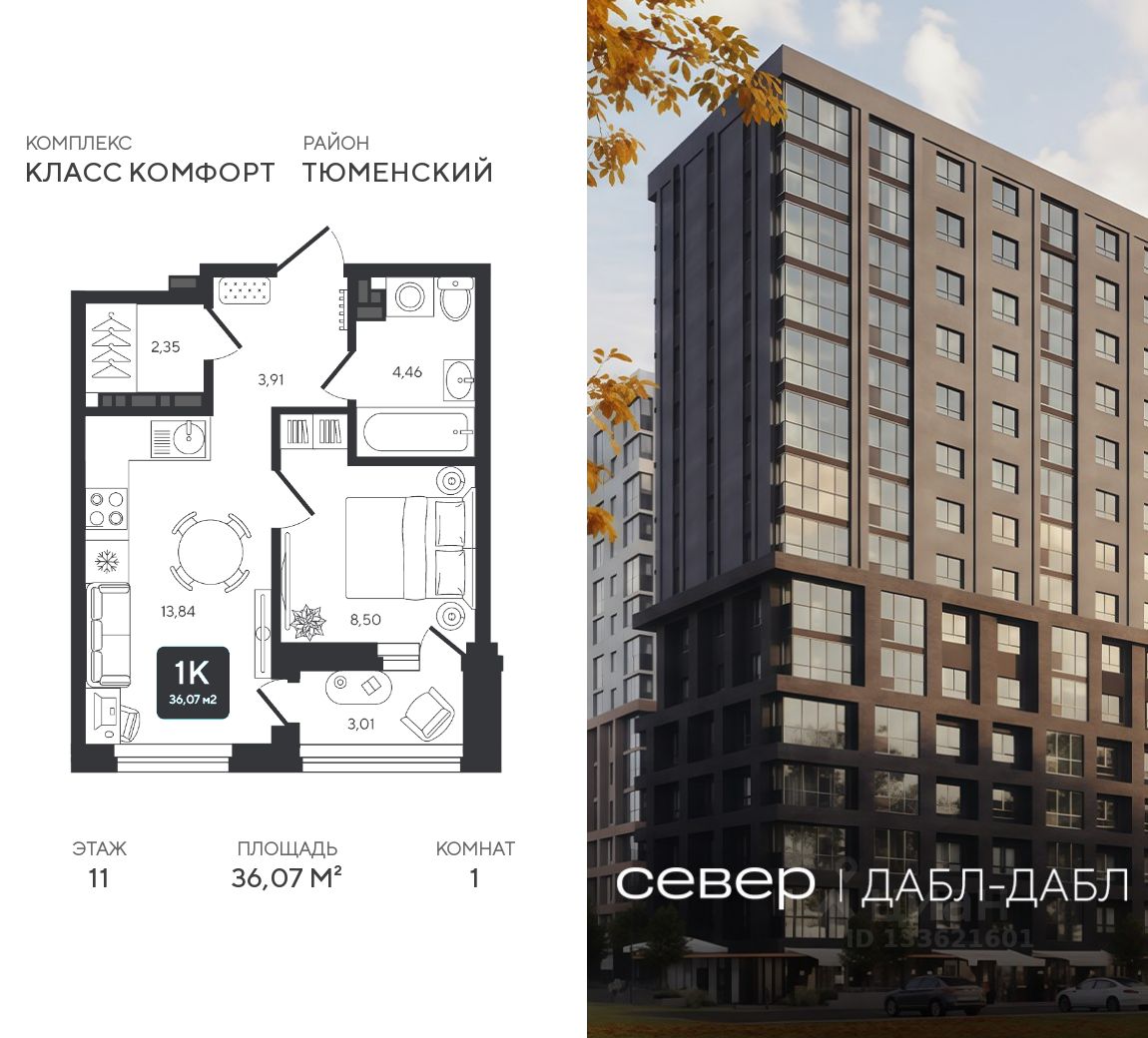 Продаётся квартира площадью 36.07 м2 в жилом комплексе ''Дабл-Дабл''. Квартира находится на 11 этаже, жилая площадь квартиры 8.5 м2, площадь просторной кухни — 13.84 м2. Среди особенностей планировки — изолированные комнаты с окнами на одну сторону, 1 совмещённый санузел.