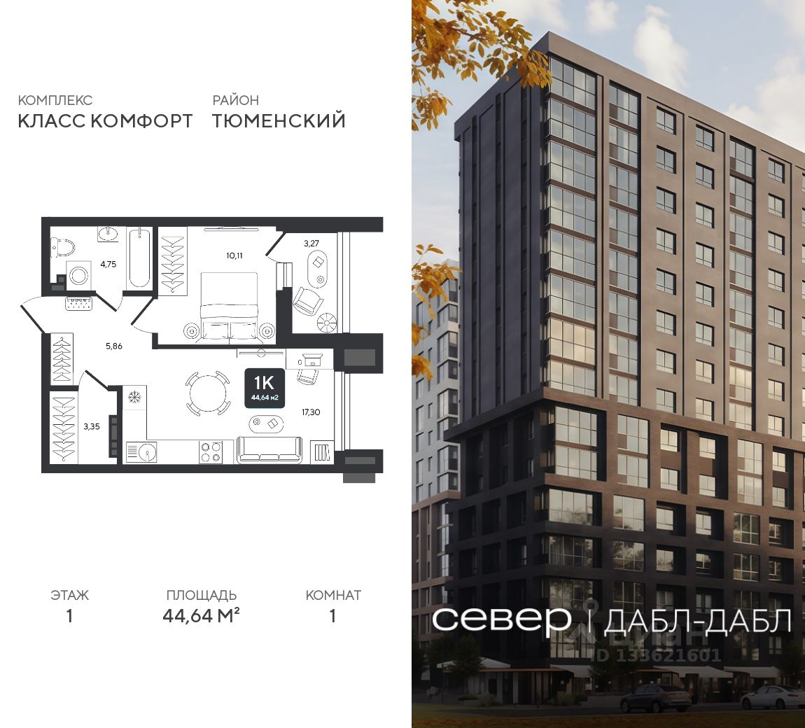 Продаётся квартира площадью 44.64 м2 в жилом комплексе ''Дабл-Дабл''. Квартира находится на 1 этаже, жилая площадь квартиры 10.11 м2, площадь просторной кухни — 17.3 м2. Среди особенностей планировки — изолированные комнаты с окнами на одну сторону, 1 совмещённый санузел.