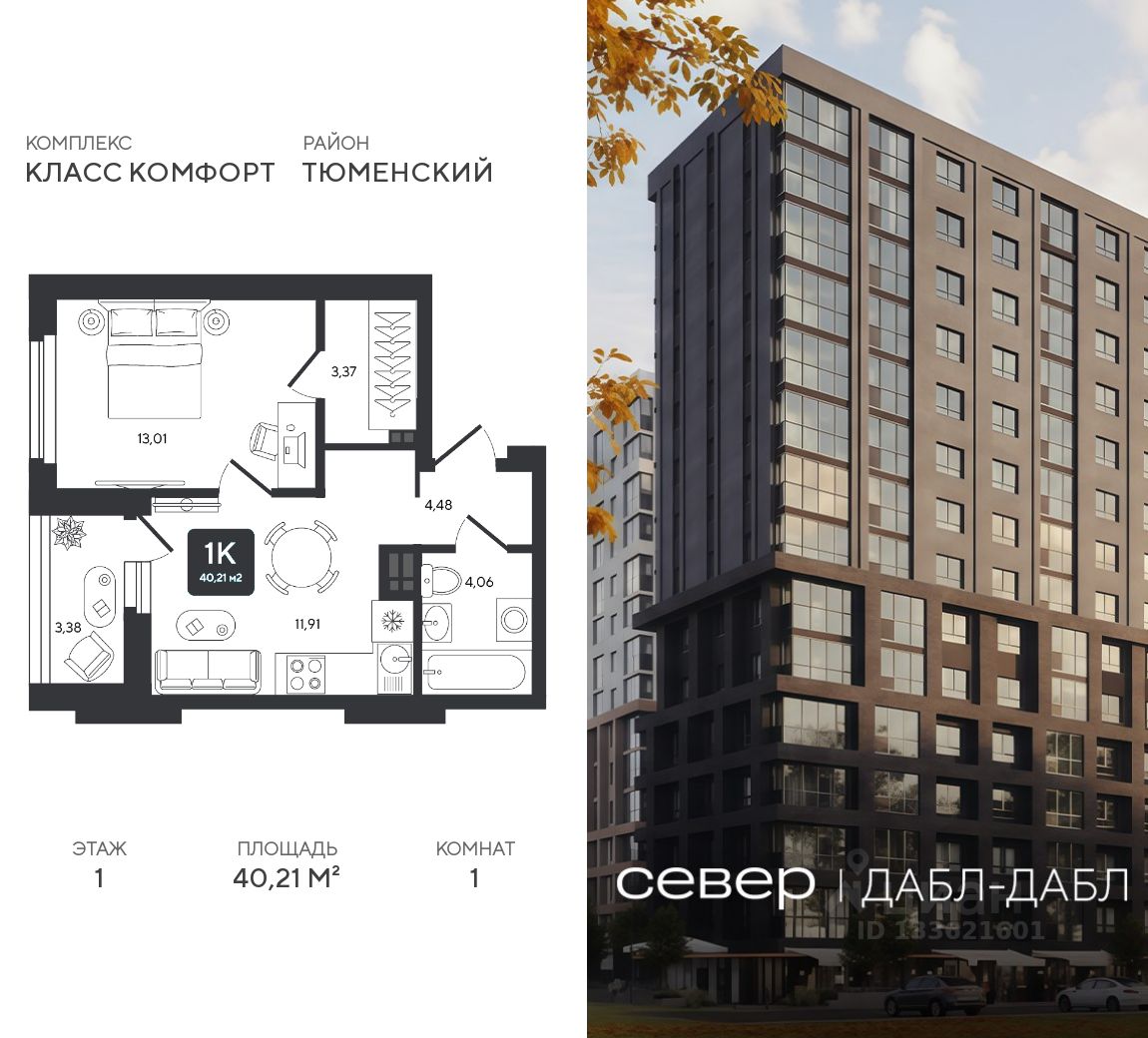Продаётся квартира площадью 40.21 м2 в жилом комплексе ''Дабл-Дабл''. Квартира находится на 1 этаже, жилая площадь квартиры 13.01 м2, площадь просторной кухни — 11.91 м2. Среди особенностей планировки — изолированные комнаты с окнами на одну сторону, 1 совмещённый санузел.