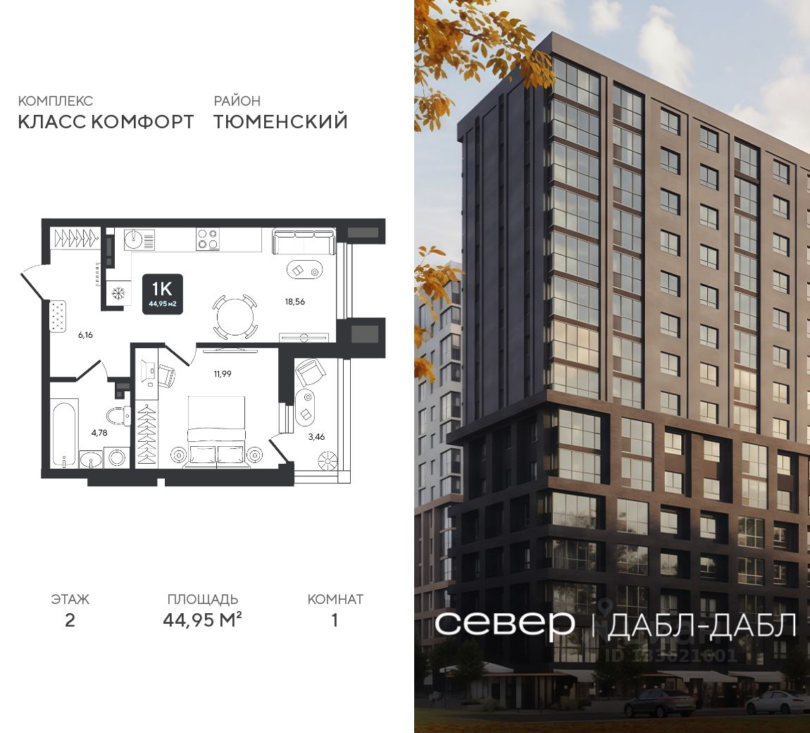 Продаётся квартира площадью 44.95 м2 в жилом комплексе ''Дабл-Дабл''. Квартира находится на 2 этаже, жилая площадь квартиры 11.99 м2, площадь просторной кухни — 18.56 м2. Среди особенностей планировки — изолированные комнаты с окнами на одну сторону, 1 совмещённый санузел.