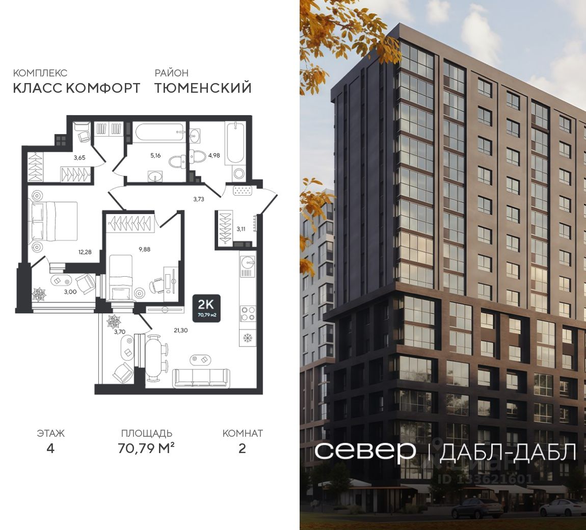 Продаётся квартира площадью 70.79 м2 в жилом комплексе ''Дабл-Дабл''. Квартира находится на 4 этаже, жилая площадь квартиры 22.16 м2, площадь просторной кухни — 21.3 м2. Среди особенностей планировки — изолированные комнаты с окнами на одну сторону, 1 совмещённый санузел.