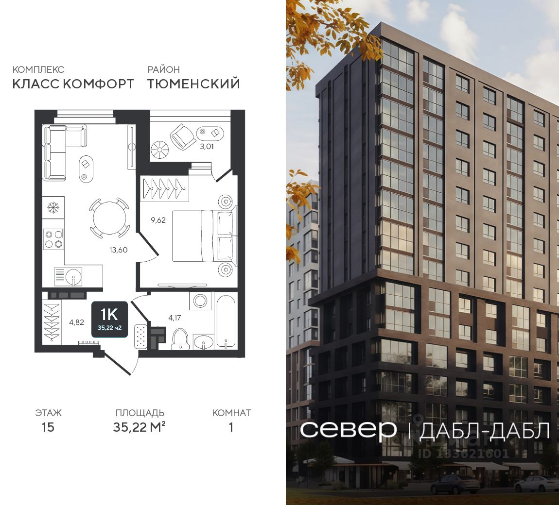 Продаётся квартира площадью 35.22 м2 в жилом комплексе ''Дабл-Дабл''. Квартира находится на 15 этаже, жилая площадь квартиры 9.62 м2, площадь просторной кухни — 13.6 м2. Среди особенностей планировки — изолированные комнаты с окнами на одну сторону, 1 совмещённый санузел.