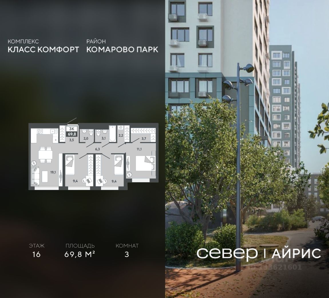 Продаётся квартира площадью 69.8 м2 в жилом комплексе ''Айрис''. Квартира находится на 16 этаже, жилая площадь квартиры 29.9 м2, площадь просторной кухни — 19.1 м2. Среди особенностей планировки — изолированные комнаты с окнами на одну сторону, 1 совмещённый санузел.