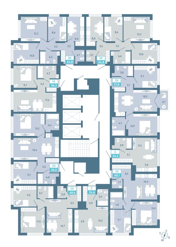 Продаётся квартира площадью 56 м2 в жилом комплексе ''Айрис''. Квартира находится на 3 этаже, жилая площадь квартиры 22.9 м2, площадь просторной кухни — 19.4 м2. Среди особенностей планировки — изолированные комнаты с окнами на одну сторону, 1 совмещённый санузел.