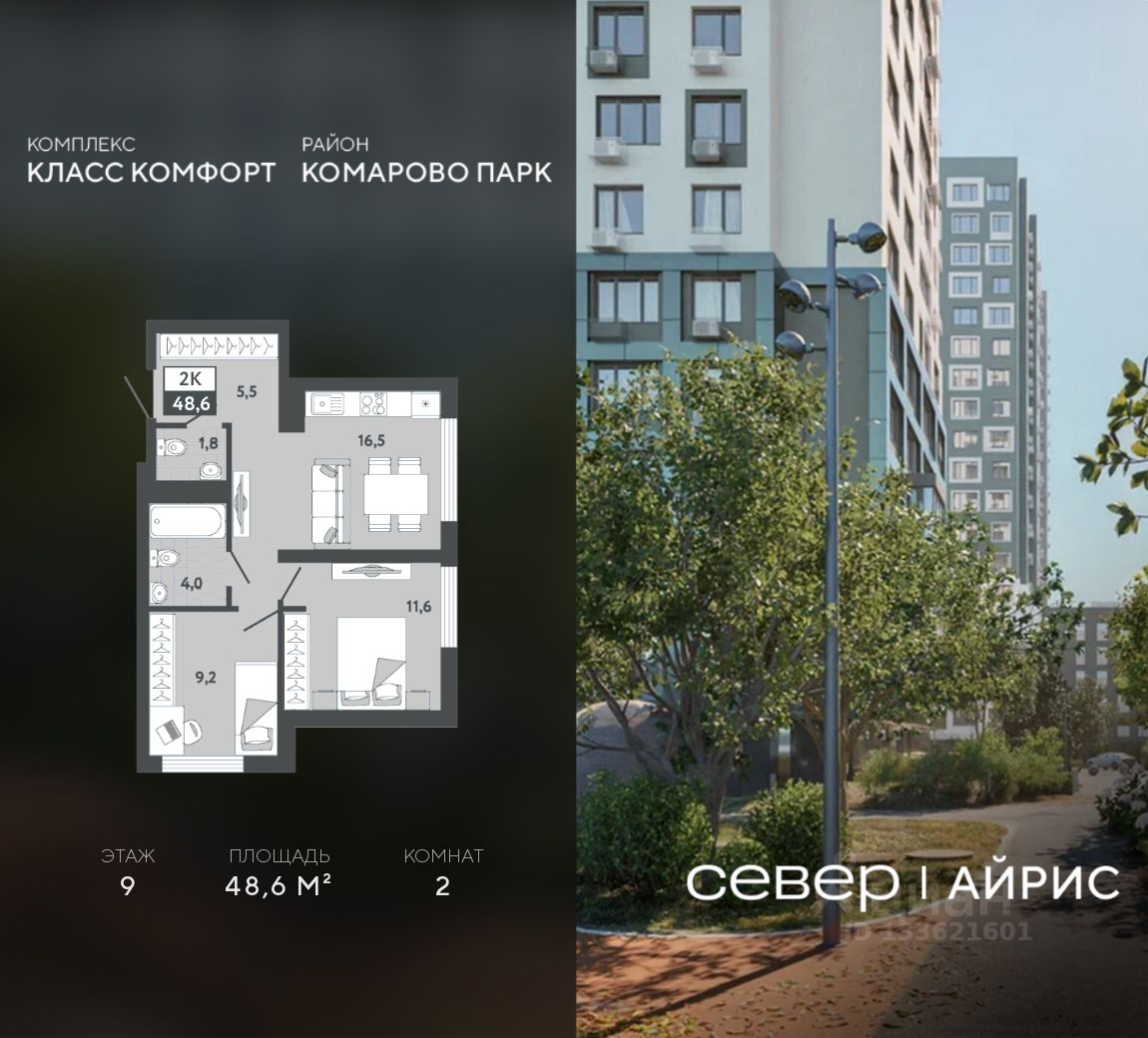 Продаётся квартира площадью 48.6 м2 в жилом комплексе ''Айрис''. Квартира находится на 9 этаже, жилая площадь квартиры 20.8 м2, площадь просторной кухни — 16.5 м2. Среди особенностей планировки — изолированные комнаты с окнами на одну сторону, 1 совмещённый санузел.