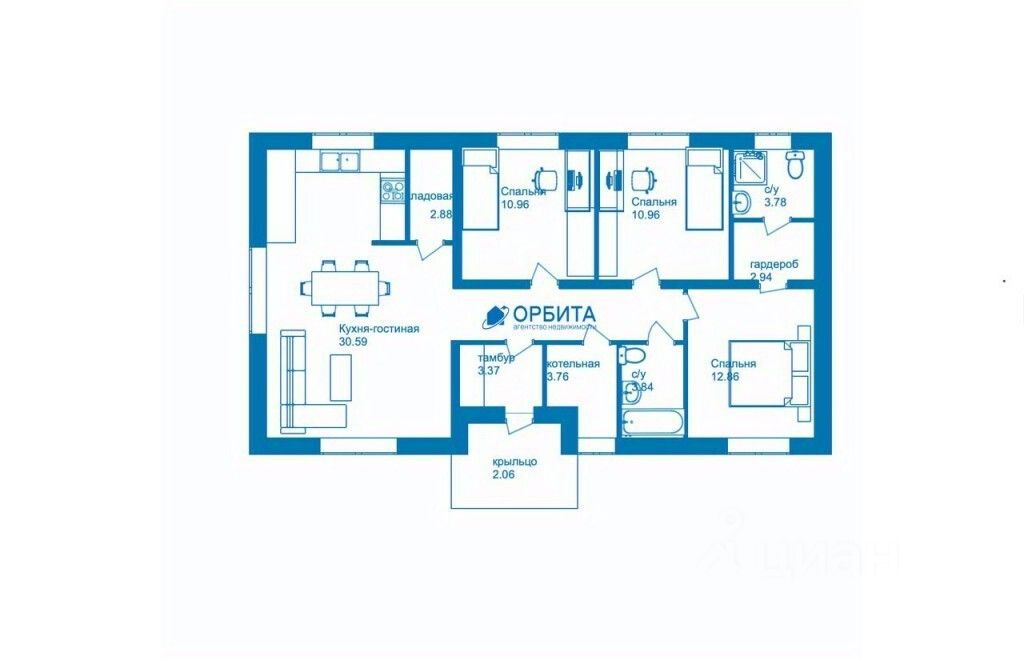 3 спальни и кухня-гостиная. Большая мастер-спальня с гардеробом, туалетом и душем для родителей.