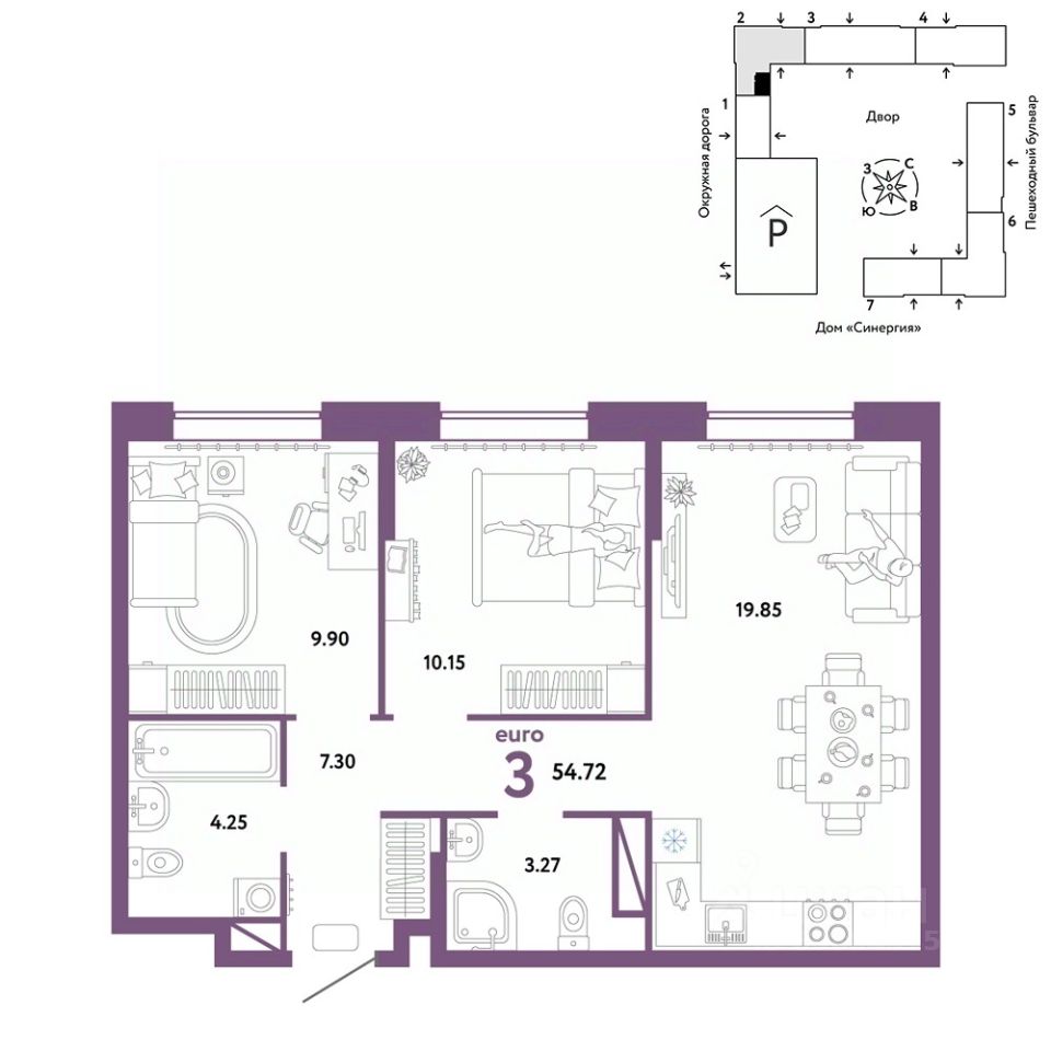 Продается 3комнатная квартира на 9 этаже от застройщика Страна Девелопмент. Площадь квартиры 54,72 кв. м.