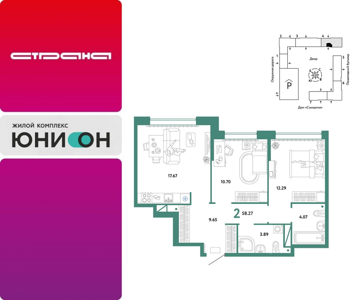 Продается 2комнатная квартира на 14 этаже от застройщика Страна Девелопмент. Площадь квартиры 58,27 кв. м.
