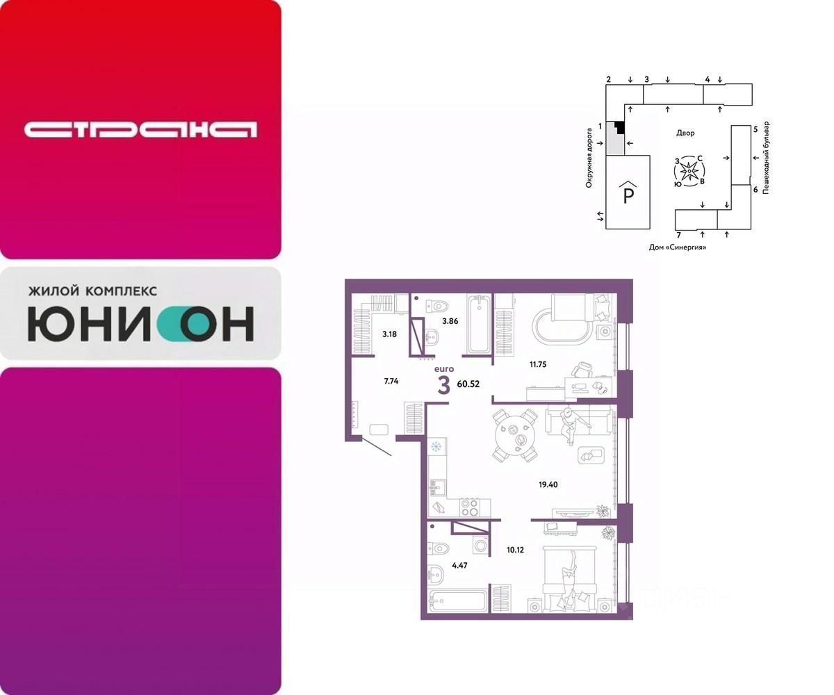 Продается 3комнатная квартира на 6 этаже от застройщика Страна Девелопмент. Площадь квартиры 60,52 кв. м.