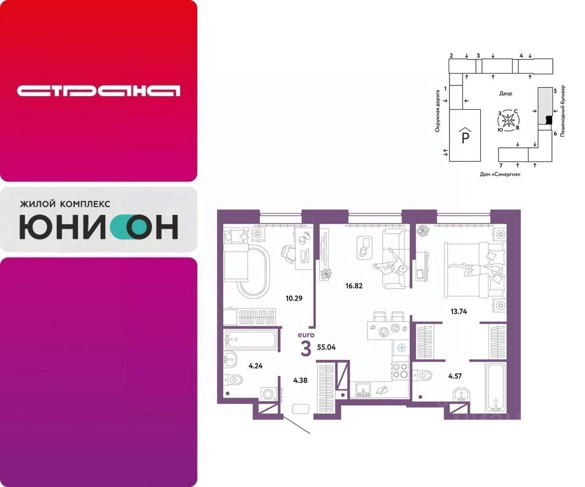 Продается 3комнатная квартира на 16 этаже от застройщика Страна Девелопмент. Площадь квартиры 54,04 кв. м.
