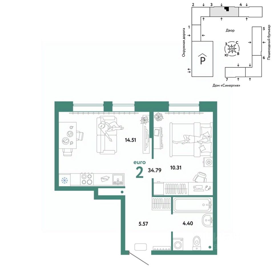 Продается 2комнатная квартира на 2 этаже от застройщика Страна Девелопмент. Площадь квартиры 34,79 кв. м.