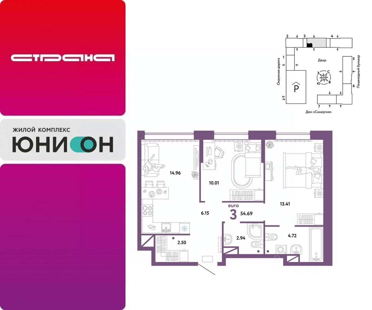 Продается 3комнатная квартира на 15 этаже от застройщика Страна Девелопмент. Площадь квартиры 54,69 кв. м.