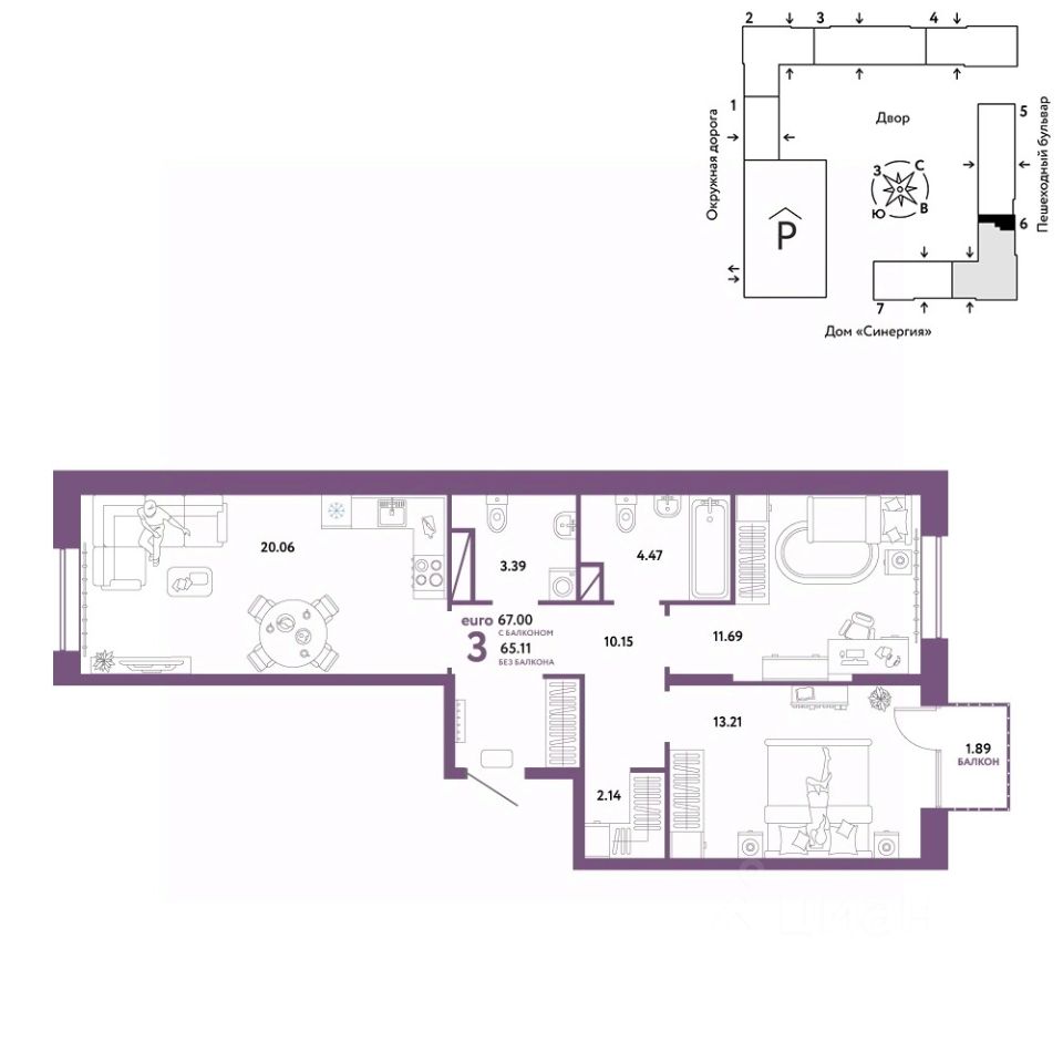 Что входит в меблировку? - Кухня с техникой и сантехникой - Диван - Кровать - Шкаф в спальне - Шкаф в прихожей