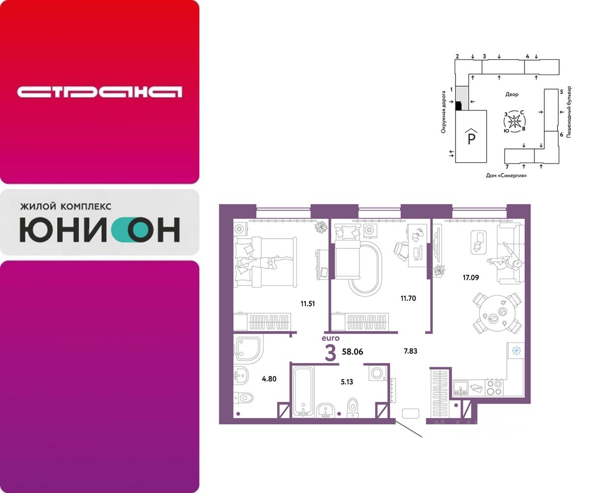Продается 3комнатная квартира на 7 этаже от застройщика Страна Девелопмент. Площадь квартиры 58,06 кв. м.