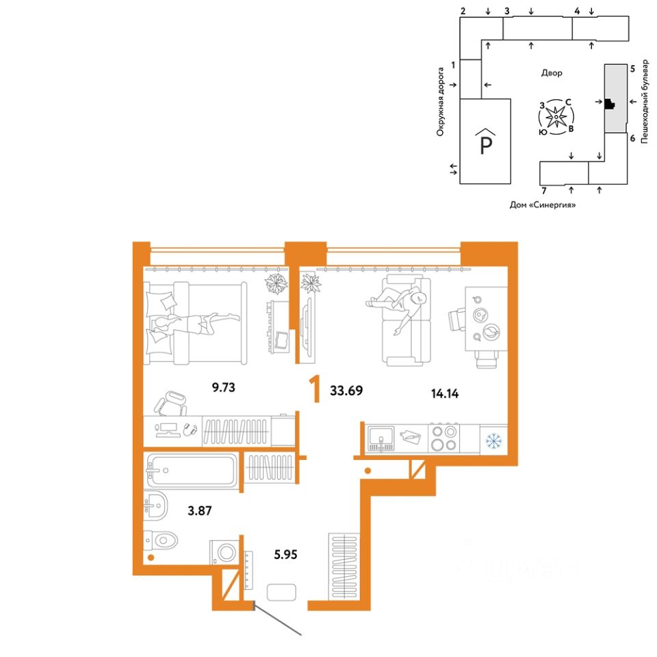 Продается 1комнатная квартира на 12 этаже от застройщика Страна Девелопмент. Площадь квартиры 33,69 кв. м.
