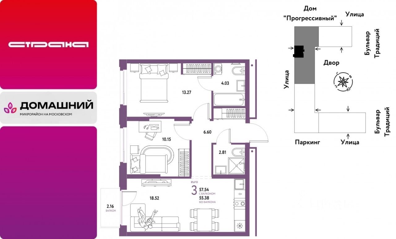 Продается 3комнатная квартира на 11 этаже от застройщика Страна Девелопмент. Площадь квартиры 57,54 кв. м.