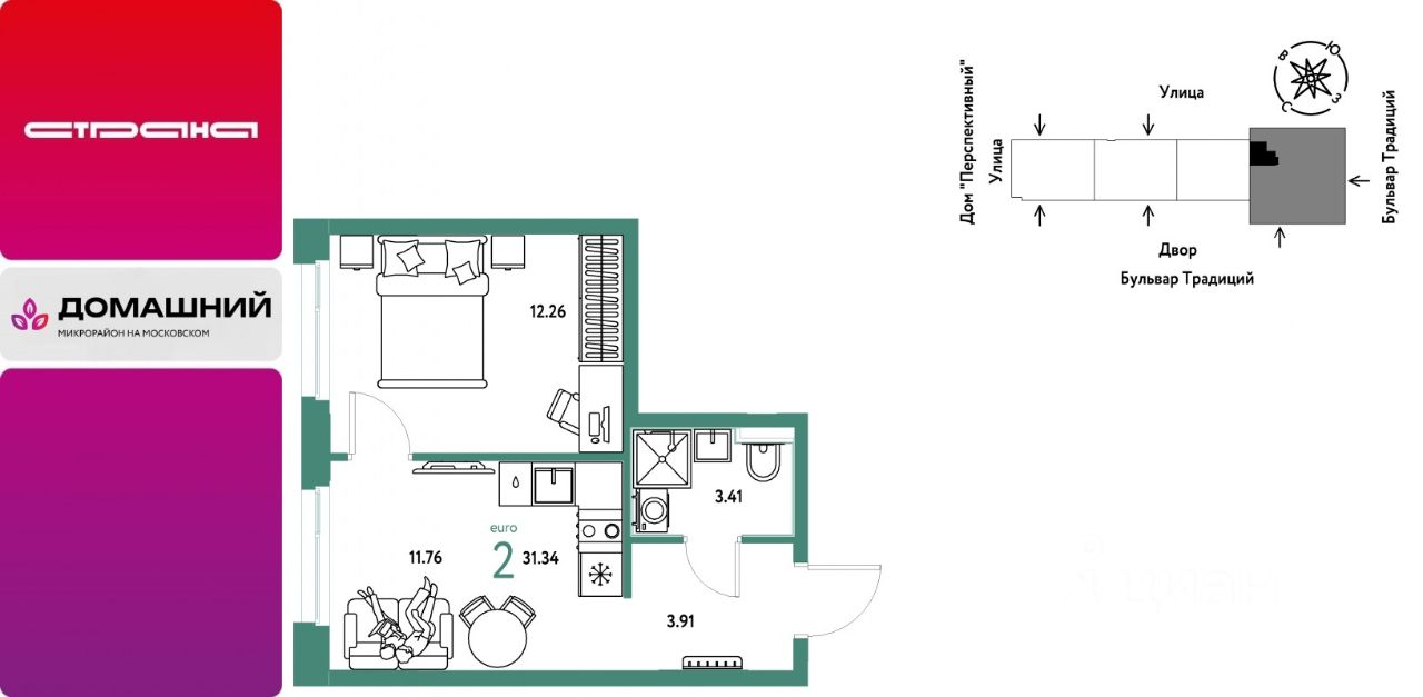 Продается 2комнатная квартира на 5 этаже от застройщика Страна Девелопмент. Площадь квартиры 31,34 кв. м.