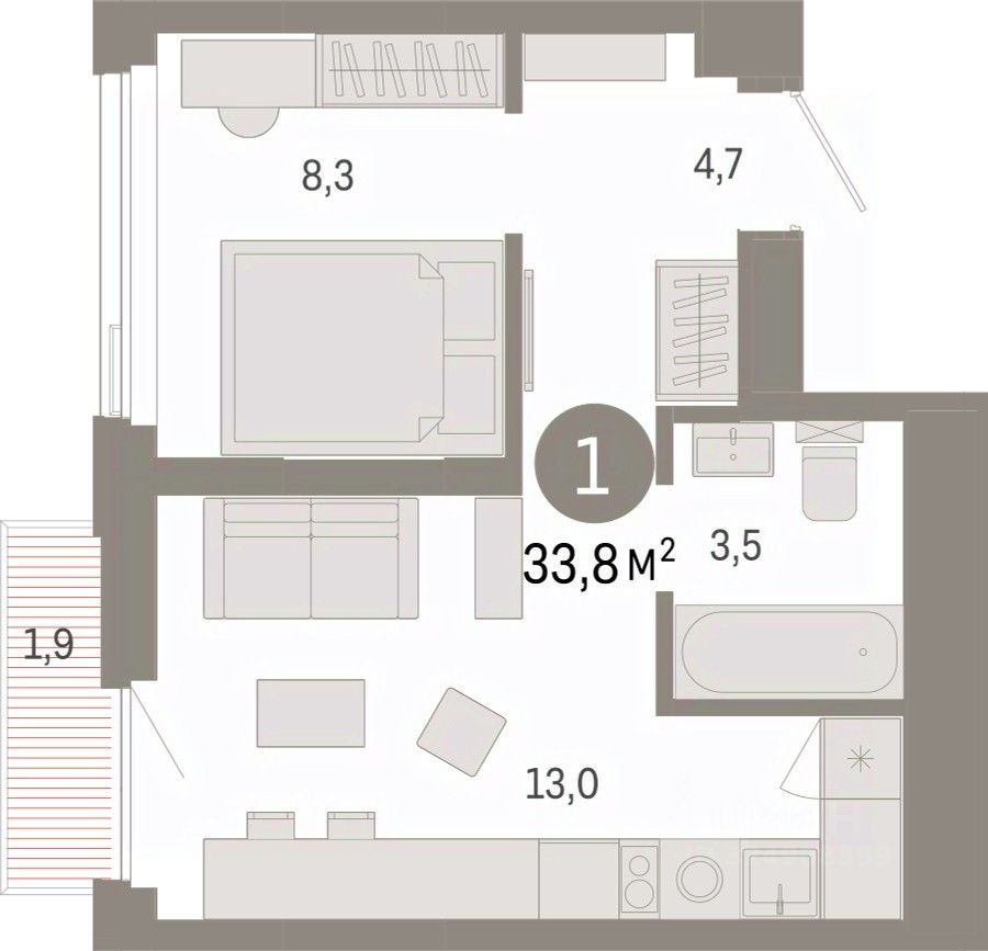 Квартира с кухней-гостиной и одной спальней в жилом районе ''Зарека''. Особенности планировки: балкон, предчистовая отделка. квартиры в нашей базе: ЗРК05.1-Ж1.17.5.