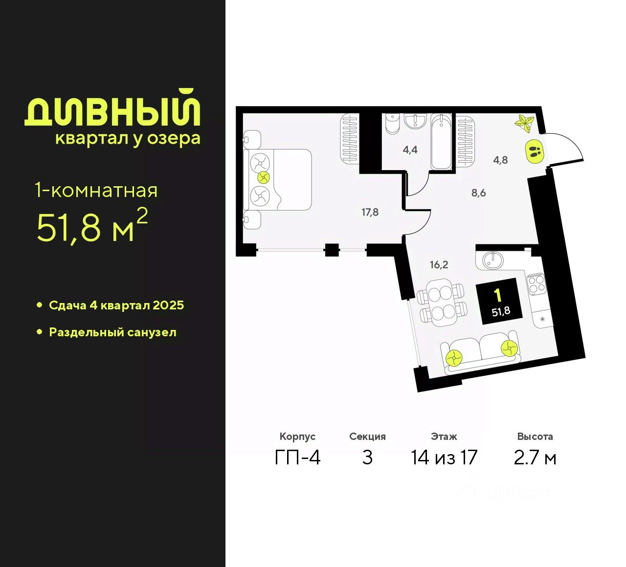 1-комн. квартира от застройщика в ЖК ''Дивный квартал у озера'' на 14 этаже. Общая площадь: 51.8 кв.м. Высота потолков 2.7 м.