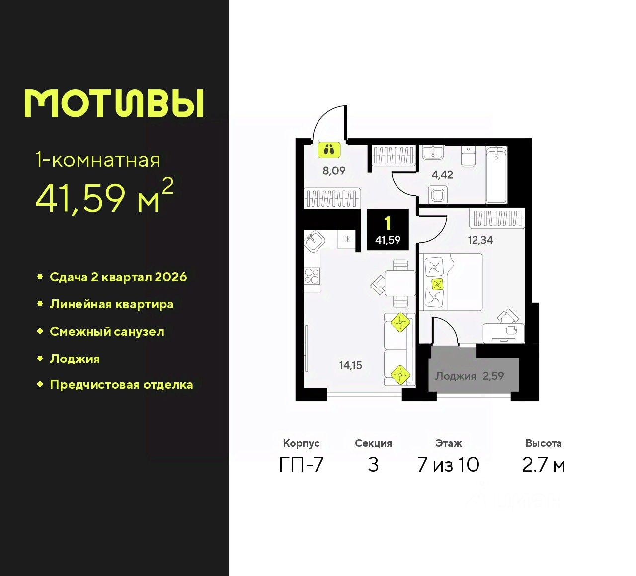 Продается 1-комн. квартира с предчистовой отделкой в ЖК ''Мотивы'' на 7 этаже. Общая площадь: 41.59 кв.м., жилая: 12.34 кв.м., площадь просторной кухни-столовой: 14.15 кв.м. Все окна выходят на одну сторону. В квартире одна лоджия, один совмещенный санузел. Высота потолков 2.7 м.