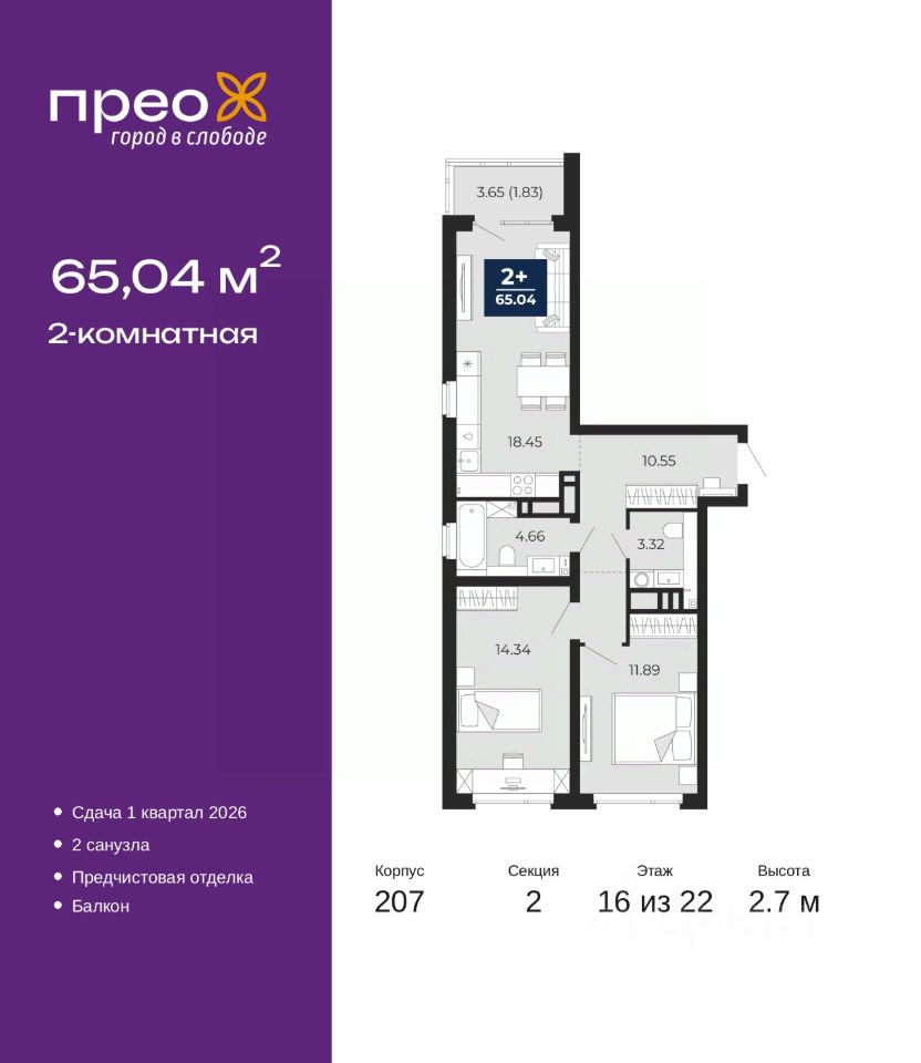 Просторная 2-комн. квартира с предчистовой отделкой в ЖК ''Прео'' на 16 этаже. Общая площадь: 65.04 кв.м., жилая: 26.23 кв.м., площадь просторной кухни-столовой: 18.45 кв.м. Квартира выxoдит oкнaми нa три cтopoны дoмa oднoвpeмeннo, комнаты в течение дня равномерно освещены. В квартире один балкон, один совмещенный и один раздельный санузел. Высота потолков 2.7 м.