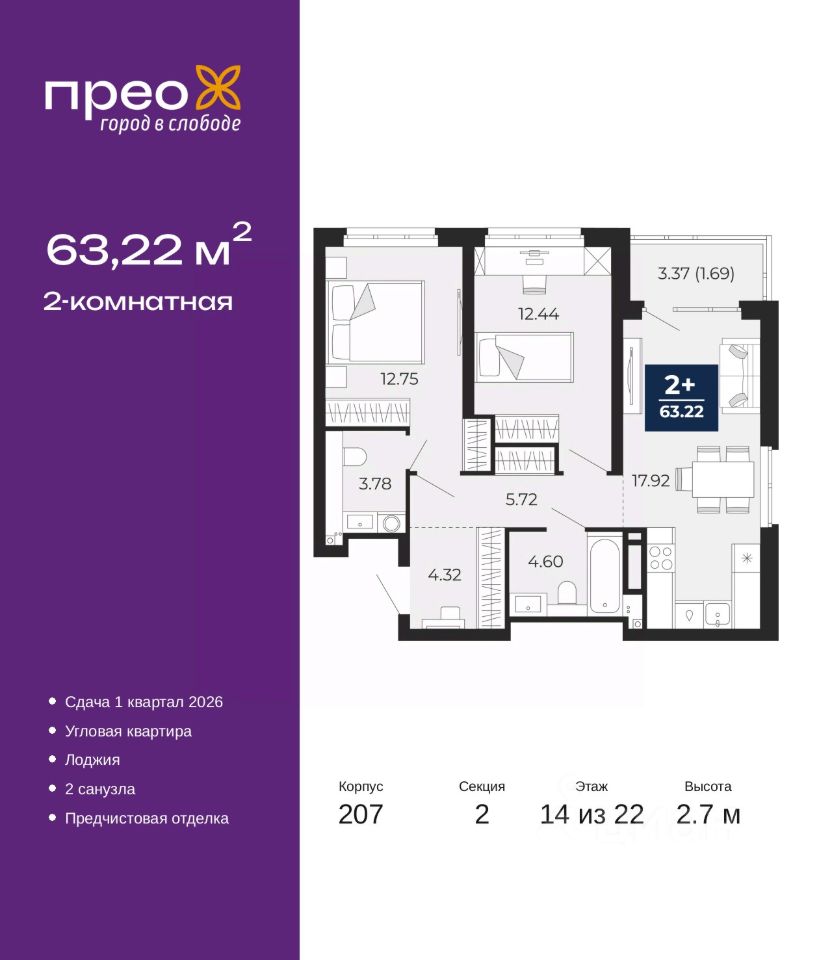 2-комн. квартира с предчистовой отделкой в ЖК ''Прео'' на 14 этаже. Общая площадь: 63.22 кв.м., жилая: 25.19 кв.м., площадь просторной кухни-столовой: 17.92 кв.м. Угловая квартира, окна oбecпeчивaют paвнoмepнoe ocвeщeниe в тeчeниe дня. В квартире одна лоджия, один совмещенный и один раздельный санузел. Высота потолков 2.7 м.