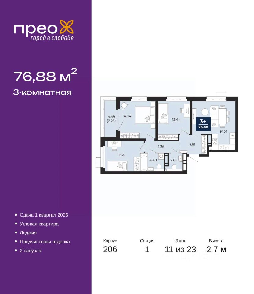 3-комн. квартира с предчистовой отделкой в ЖК ''Прео'' на 11 этаже. Общая площадь: 76.88 кв.м., жилая: 38.22 кв.м., площадь просторной кухни-столовой: 19.21 кв.м. Квартира угловая, идеально подойдет любителям тишины и панорамных видов. В квартире одна лоджия, один совмещенный и один раздельный санузел. Высота потолков 2.7 м.