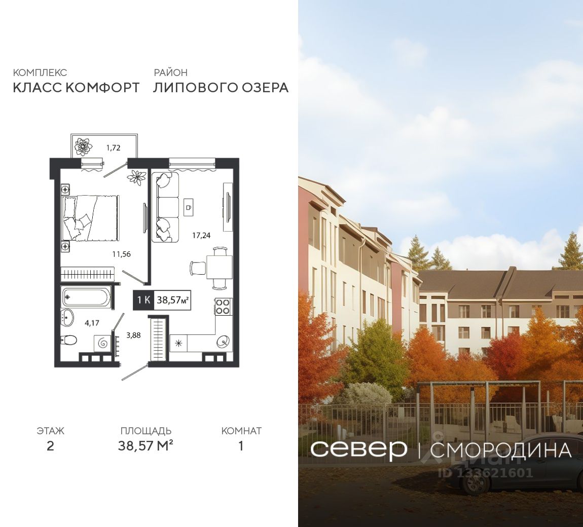 Продаётся квартира площадью 38.57 м2 в жилом комплексе ''Смородина''. Квартира находится на 2 этаже, жилая площадь квартиры 11.56 м2, площадь просторной кухни — 17.24 м2. Среди особенностей планировки — изолированные комнаты с окнами на одну сторону, 1 совмещённый санузел.