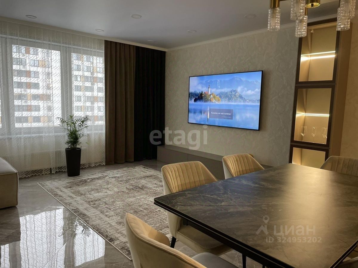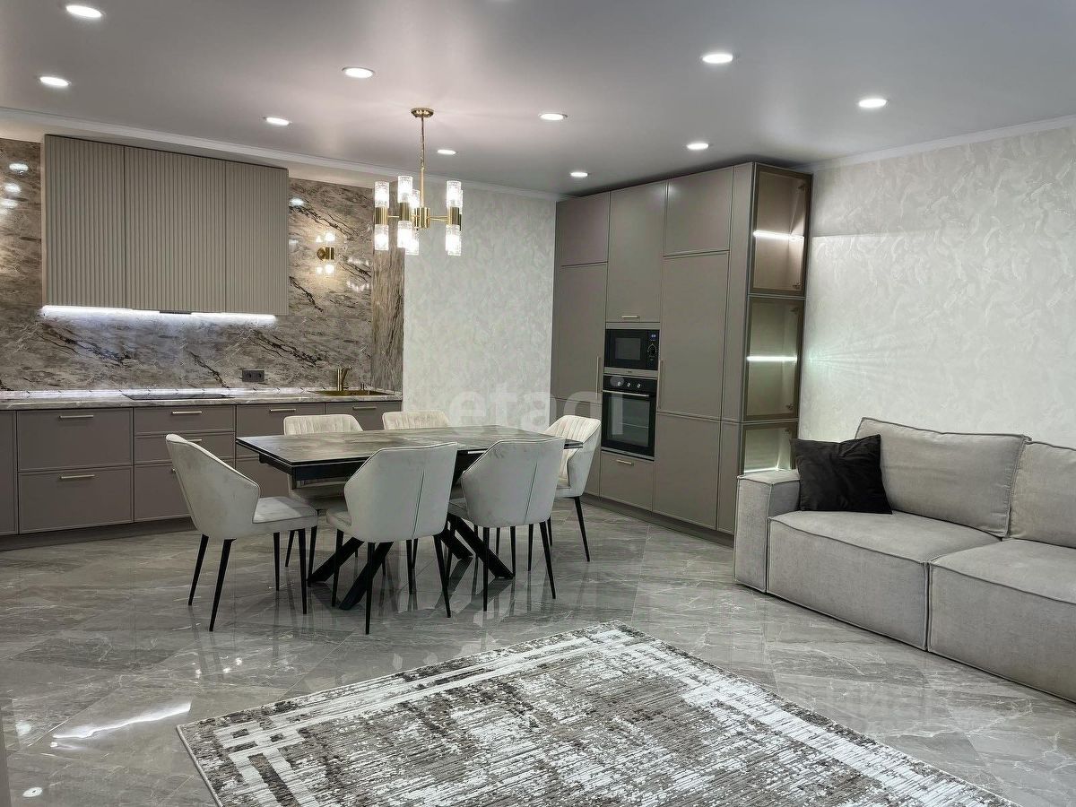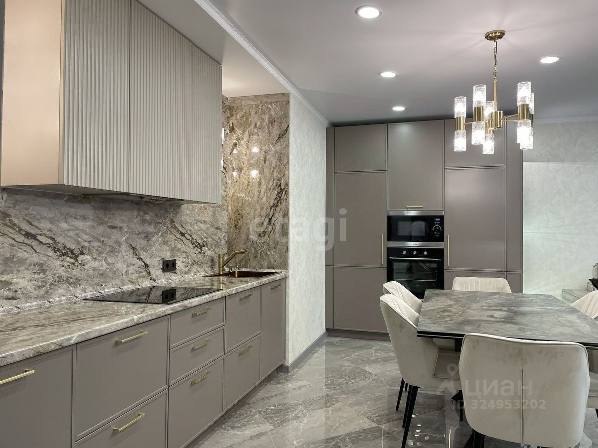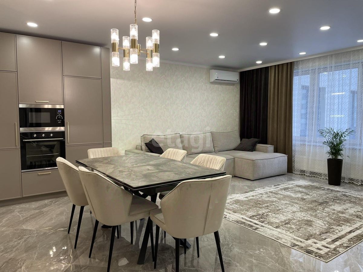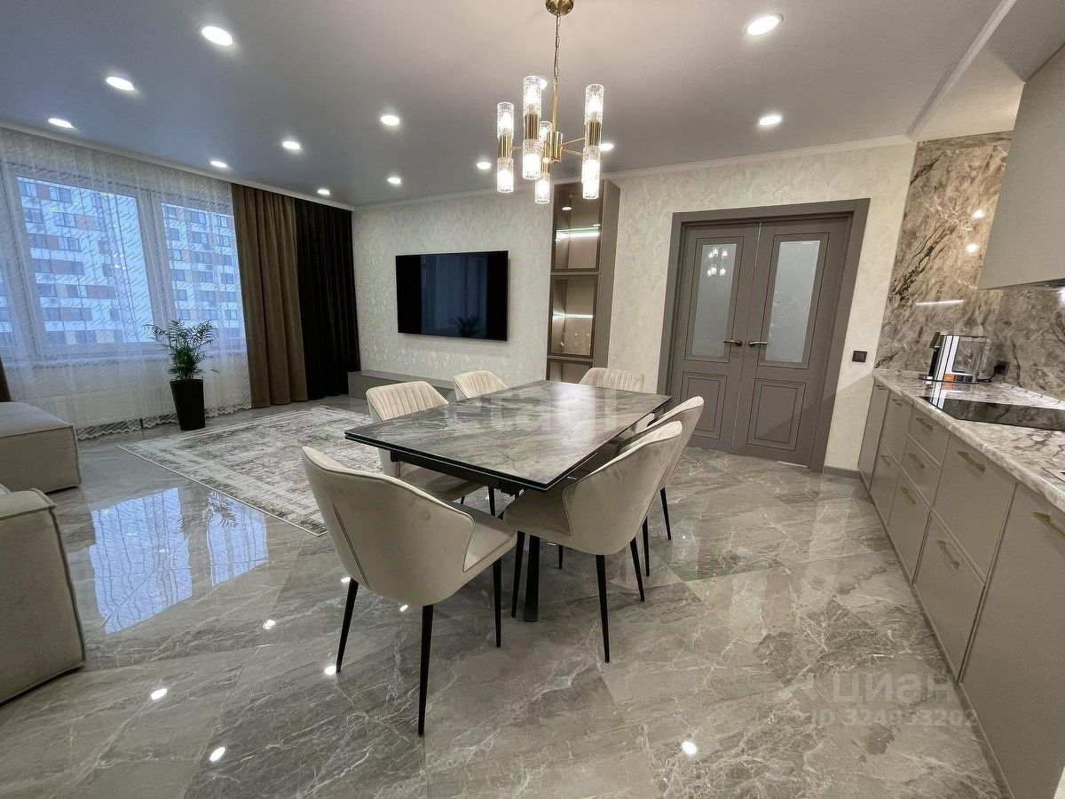 Уважаемые покупатели! Представляем вам 3х комнатную квартиру с кухней-гостиной в самом популярном жилом комплексе ''Новин''. Ремонт в квартире проводился по дизайн-проекту. Просторная кухня гостиная, 3 спальные зоны из них 2 детские комнаты, гардеробная комната с системой хранения, 2 сан.узла. В квартире установлены датчики теплого пола, кондиционер, что позволяет создавать удобный для каждого микроклимат. Для ремонта квартиры использовались дорогие, качественные материалы - на стенах итальянские заказные обои, напольное покрытие в коридоре, кухне-гостиной и сан.узлах- качественный керамогранит фирмы ''Лапарет'', в спальнях на полу влагостойкий ламинат 12 класса, дизайнерский текстиль и осветительные приборы.