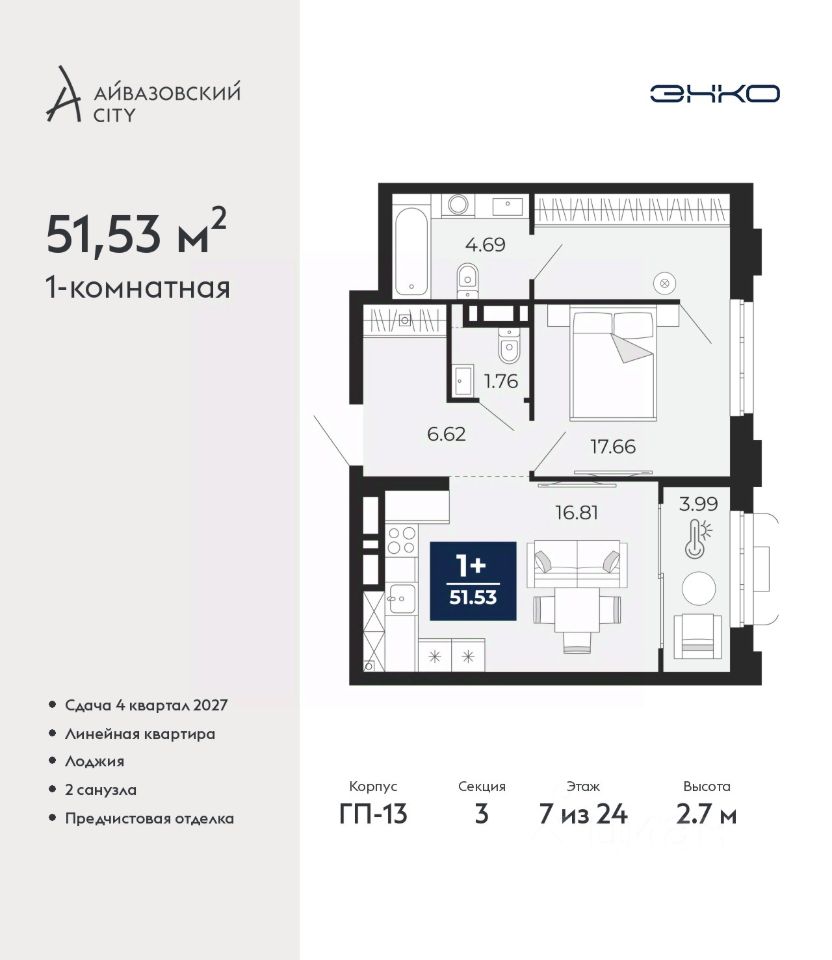 1-комн. квартира с предчистовой отделкой в ЖК ''Айвазовский City'' на 7 этаже. Общая площадь: 51.53 кв.м., жилая: 17.66 кв.м., площадь просторной кухни-столовой: 16.81 кв.м. Все окна выходят на одну сторону. В квартире одна лоджия, один совмещенный и один раздельный санузел. Высота потолков 2.7 м.