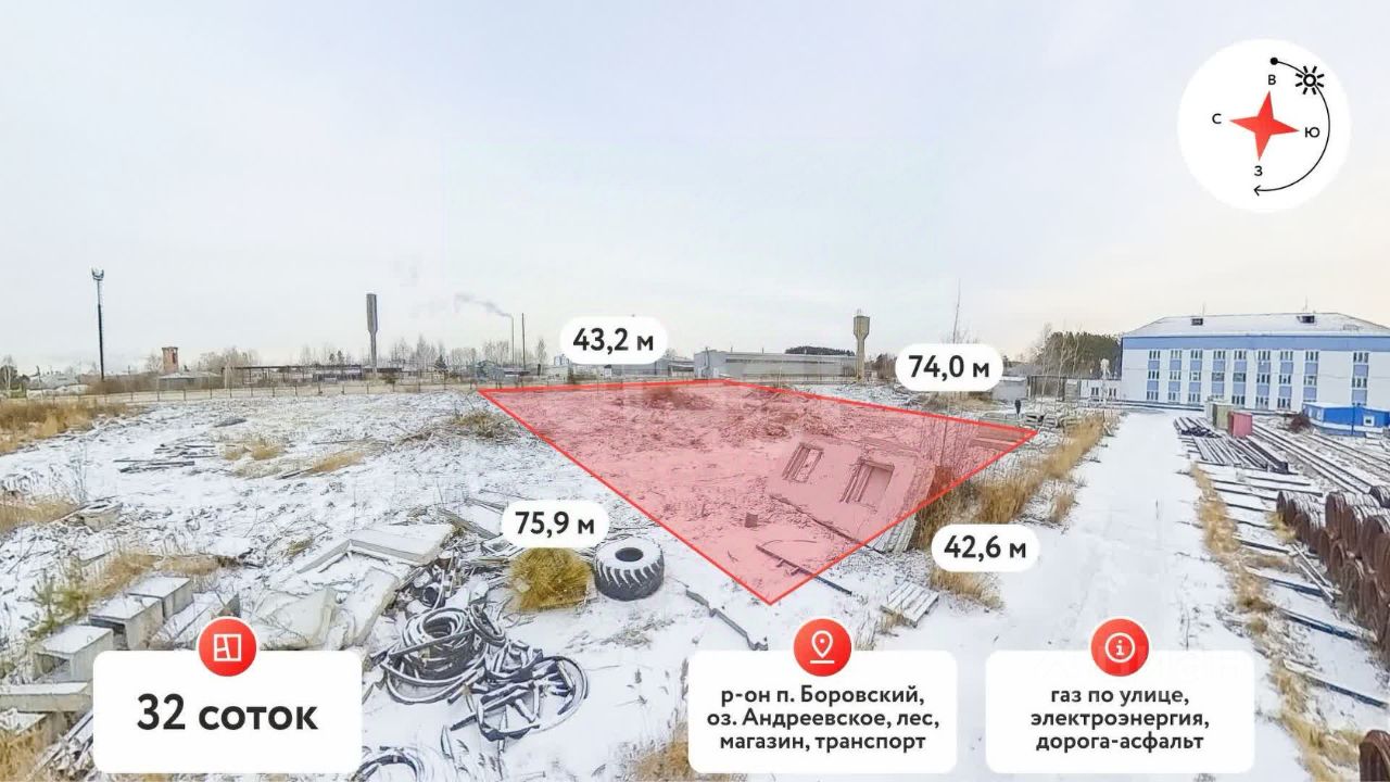 В продаже отличный участок правильной формы, расположенный в посёлке Боровский, всего в 12 км от Тюмени по Ялуторовскому тракту. Это идеальное место для вашего бизнеса, обеспеченное всей необходимой инфраструктурой!