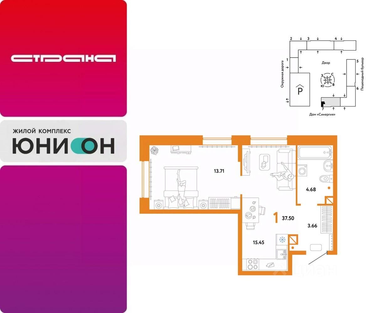 Продается 1комнатная квартира на 4 этаже от застройщика Страна Девелопмент. Площадь квартиры 37,5 кв. м.