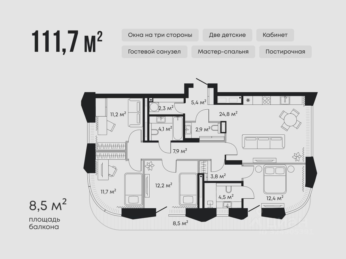 Планировка предусматривает мастер-спальню с выходом на балкон, две детские комнаты, кабинет, просторную кухню-гостиную, дополнительный санузел и постирочную.