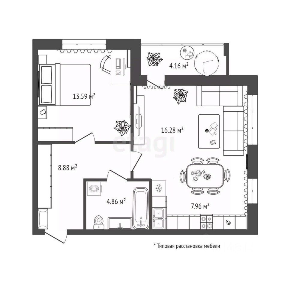 О квартире: Светлая, просторная квартира расположенная на 4-м этаже состоящая из спальни площадью 13,59 кв.м., гостиной 16,28 кв.м., и следующих вспомогательных помещений: кухня площадью 7,96 кв.м. (кухня не отделена внутренней перегородкой от гостиной), совмещённый санузел площадью 4,86 кв.м., коридор площадью 8,88 кв.м., а также лоджии площадью 2,08 кв.м. (с учётом понижающего коэффициента 0,5). Лоджия с панорамным остеклением.