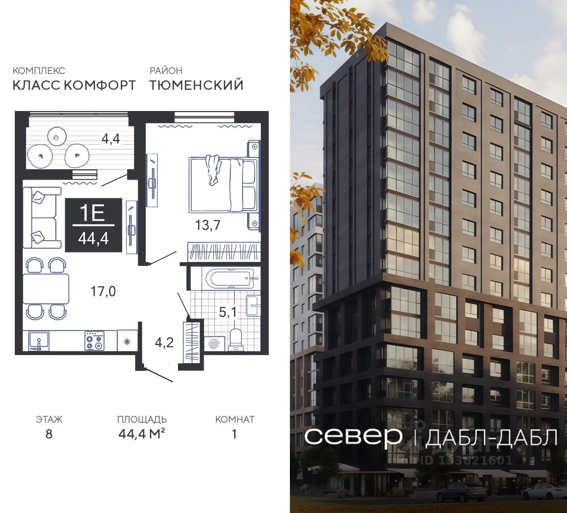 Продаётся квартира площадью 44.4 м2 в жилом комплексе ''Дабл-Дабл''. Квартира находится на 8 этаже, жилая площадь квартиры 13.7 м2, площадь просторной кухни — 17 м2. Среди особенностей планировки — изолированные комнаты с окнами на одну сторону, 1 совмещённый санузел.