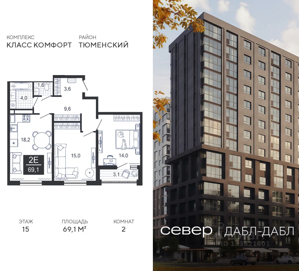 Продаётся квартира площадью 69.1 м2 в жилом комплексе ''Дабл-Дабл''. Квартира находится на 15 этаже, жилая площадь квартиры 29 м2, площадь просторной кухни — 18.2 м2. Среди особенностей планировки — изолированные комнаты с окнами на одну сторону, 1 совмещённый санузел.