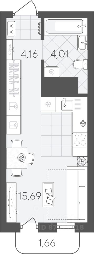 Студия площадью 25.52 кв.м на 18 этаже — хороший вариант для первой квартиры. Функциональная планировка позволит легко зонировать пространство и отделить зону готовки, гостиную и спальню.