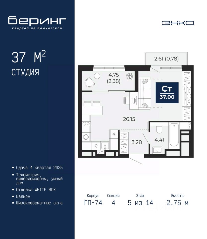 Продается 1-комн. квартира-студия с предчистовой отделкой в ЖК ''Беринг'' на 5 этаже. Общая площадь: 37 кв.м., площадь гостиной 26.15 кв.м., из которых 5 кв.м. выделено под кухонную зону. Все окна выходят на одну сторону. В квартире один балкон, один совмещенный санузел. Высота потолков 2.75 м.